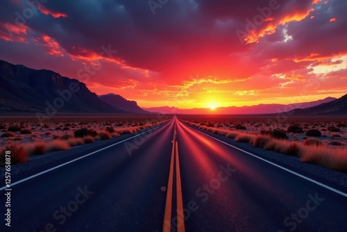 Fiery hues paint a deserted Utah highway at sunset , nature, intense
