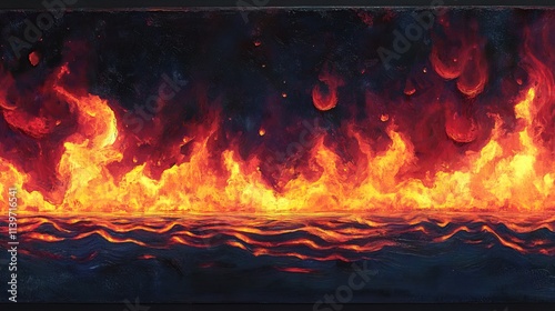 fire, flames, inferno, blaze, burning, hot, heat, dark, water, ocean, sea, cosmic, space, star, planet, night, energy, power, intense, bright, light, orange, red, yellow, abstract, art, painting, illustration, texture, background, design, dramatic, mystical, magical, surreal, fantasy, powerful, destructive, danger, apocalypse, catastrophy, chaos, vibrant, colours, glowing, hell, lava, molten