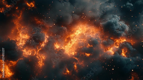 fire, flames, smoke, dark, explosion, inferno, burning, blaze, combustion, heat, hot, intense, energy, power, bright, orange, red, black, grey, charcoal, ember, spark, glowing, cosmic, nebula, cloud, dust, particle, debris, apocalyptic, destructive, chaos, tumult, rage, fury, violent, dramatic, texture, abstract, background