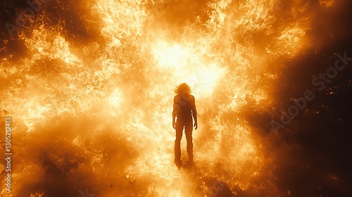 fire, flames, inferno, blaze, burning, combustion, heat, hot, wall, firestorm, explosion, eruption, silhouette, person, figure, human, man, woman, standing, facing, dark, light, bright, orange, yellow, background, abstract, art, digital, artwork, graphic, design, powerful, intense, dramatic, energy, power, mythical, fantasy, surreal, mysterious, awe, wonder