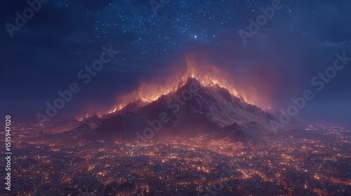 Fiery Mountain Landscape at Night Cityscape Inferno Dramatic Sky