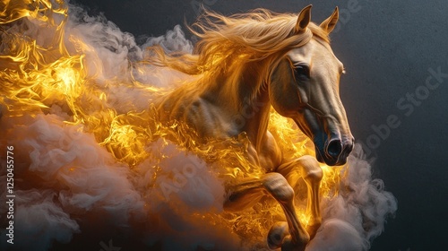 horse, palomino, fire, smoke, leaping, power, energy, majestic, fast horse, speed, animal, nature, fantasy, mythical, freedom, wild, beauty, strength, grace, elegance, spirit, passion, thews, equine, mammal, running, movement, action, dramatic, art, illustration, digital, photo, background, design, image, wallpaper, picture, vibrant, intense, fiery