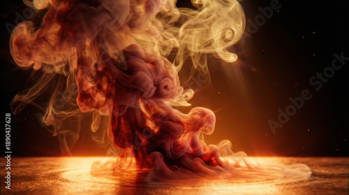 Fiery red and golden smoke swirling dramatically on a dark background with light rays
