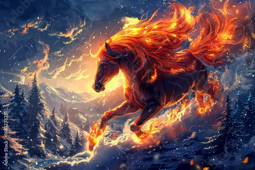 Fiery Red Horse Running Through Snowy Forest – Year of the Horse Illustration with Copy Space