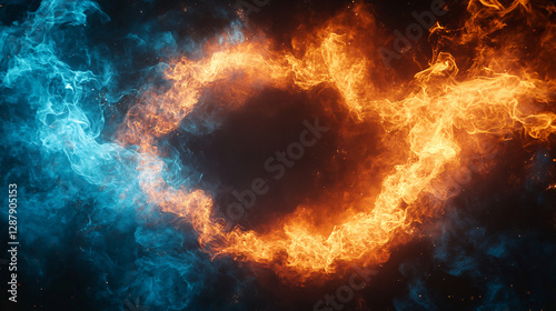 Fiery Ring of Opposites: A mesmerizing digital artwork depicts a circular frame of intense flames, with vibrant orange and blue hues creating a captivating contrast.