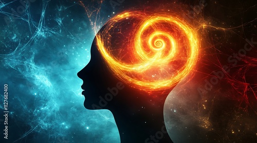 Fiery spiral inside a woman's head silhouette against a cosmic backdrop.