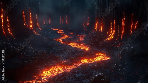 fire, forest, night, dark, fantasy, lava, stream, glowing, ember, tree, ominous, atmosphere, landscape, magma, inferno, hot, heat, burning, surreal, magical, mysterious, path, trail, texture, digital artwork, illustration, artwork, fantasy art, night scene, fiery, red, orange, black, smoke, dark background, dramatic, intense