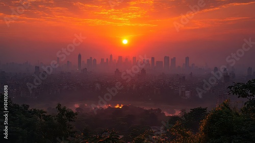 sunrise, sunset, city landscape, city, skyline, urban, hazy, fog, mist, atmosphere, light, warmth, colours, vibrant, orange, red, gold, fiery, glow, horizon, cloud, sky, morning, evening, dramatic, view, panorama, top, perspective, high, elevation, landscape, nature, tree, foliage, silhouette, building, structure, dense, huge, immensity, calmness, lake, park, illumination