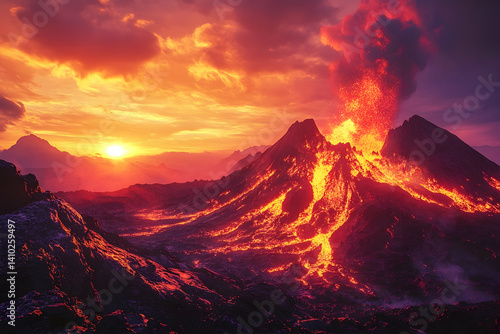volcano, eruption, magma, sunset, sunrise, fiery, mountain, landscape, nature, earth, geology, volcanic, ash, smoke, heat, red, orange, glowing, hot, powerful, disaster, destruction, hazardous, geothermal, energy, environment, sky, cloud, peak, crater, nature, power, amazing, beautiful, stunning, dramatic, spectacular, molten, rock, fire