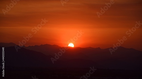 fiery sunset over the front range of the colorado mountains due to the smoke from the western forest fires, as seen from broomfield, colorado
