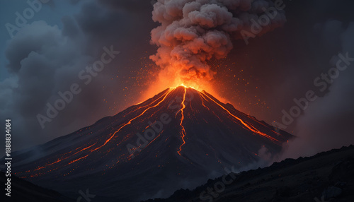 Fiery Volcano Eruption: Witness the raw power of nature as a volcano erupts, spewing forth glowing lava and a cloud of smoke against a dramatic sky.