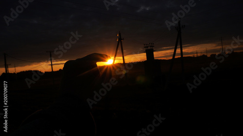 figure on a sunset background, sun and a man, a man in the dark, poses