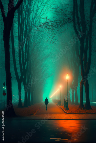 Figure walking down tree lined path with street lamps in green fog, vertical. Generative AI