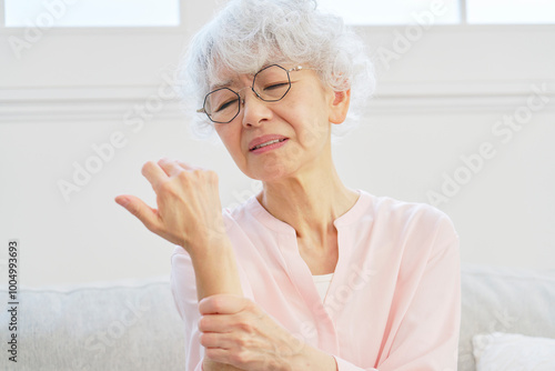 woman, aged, hand, aged, pain, rheumatism, wrist, injury, 60's, aged, fracture, paralysis, irritation, painful, arm, neuralgia, joint, living room, home, room, elder, house, grandmother, indoor, indoor, unrest, apprehension, japanese, asian
