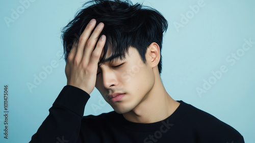 stress, trouble, man, youth, asian, black hair, depression, solitude, grief, apprehension, drop, fatigue, anguish, unrest, embarrassment, despair, thought, contemplation, introspection, feeling, expression, hand, face, coiffure, modern, portrait, closeup, people, alone, quiet, stillness, dark, heavy, seriousness, conflict, ambivalence, repentance, frustration, flop