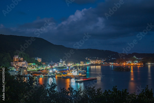 japan, shizuoka, sea, island, pacific ocean, rock, wave, fall, holiday, vacation, journey, travel, tour tourism, night, nightscape, port, boat, ship, barge, freighter, daybreak, morning sun, torii, bay, port, landscape, view, view, fishing port, lighting, light, light, light, sail, dock