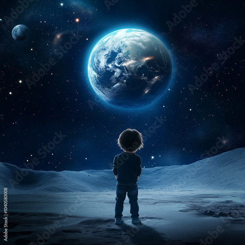 earth, cosmos, moon, astronomy, boy, planet, space, night, sky, cloud, sun, star, world, universe, sea, nature, light, science, dark, three-dimensional, moonlight, tone, view, all, celestial bodies, blue, universe, cosmos, illustration, children, water, dream, fantasy, snow, science fiction