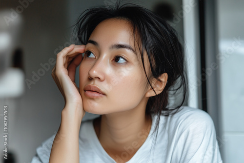 woman, relax, indoor, woman, face, beauty, hair, smiling, lady, person, smile, people, skin, hand, up, eye, model, look, brunette, thought, natural, fashion, head, listening, 1
