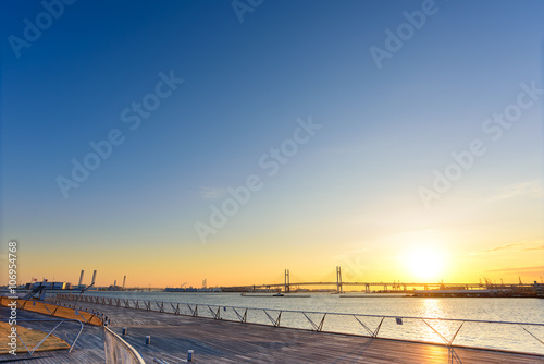 bridge, morning, sun, morning sun, blue skies, sea, port, suspension bridge, bay bridge, wave, city, tour tourism, tour tourism, dock, yokohama, front, copy space, refreshing, view, landscape, blue, orange, catwalk