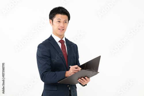 speech, meeting, speaking, workshop, portrait, version, meeting, suit, businessman, man, white background, smile, cravat, 30s, work, work, salaried employee, japanese, business, people, employee, waist up, young, salesman, file, binder, information, interview, image, chief, boss, refer, manager, adviser, leadership, conversation, parley, corporation, trade, middle-aged, japan