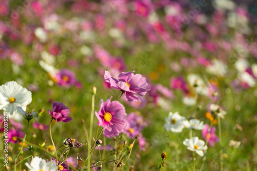 flower, nature, garden, plant, purple, pink, plant, flowering, summer, bloom, field, beauty, grass, up, leaf, macro, outdoors, floral, flower, full bloom, cosmos, red, white, wind, swing, fall, landscape, view, material, light, blue skies, sky, copy space, advertisement, commercial