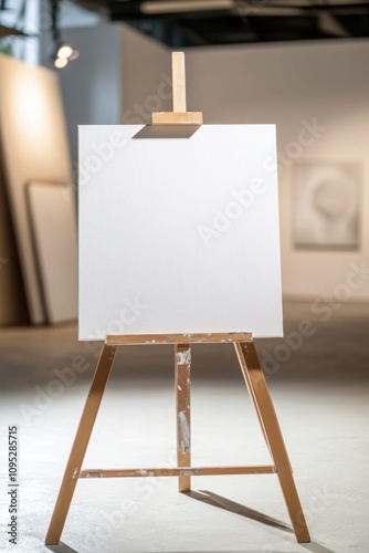 明るくミニマルなアートスタジオの木製イーゼルに置かれた空白のキャンバス