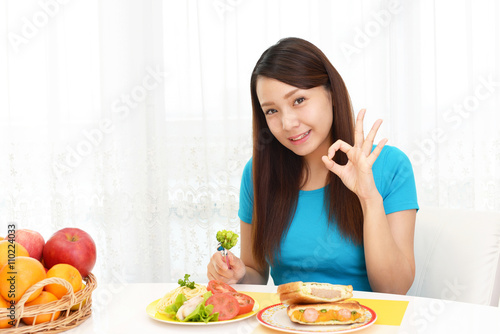 woman, people, food, meal, fruit, vegetable, bread, salad, sandwich, tomatoes, lettuce, pasta, woman, adult, young, sweet, clean, meal, mealtime, eatery, expression, dish, diet, calorie, cosmetic, health, smile, smile, smile, happy, beauty, model, girl, fun, lifestyle, lively, person, alone, business, okinawa, japanese, asian, copy space, waist up