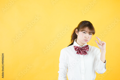 alone, sweet, asian, copy space, school, portrait, people, uniform, study, girl, woman, school, student, indoor, training, japanese, student, young, youth, yellow, waist up, face, gesture, bit, small, magnitude, finger, slit