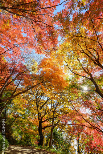 fall, wood, plant, nature, landscape, leaf, yellow, sunny, blue skies, open air, japan, kobe, fall, forest, sky, acer, green, park, season, orange, foliage, red, pigmentation, light, outdoors, colourful, maple, maple, red, tourist attraction, tour tourism, showplace