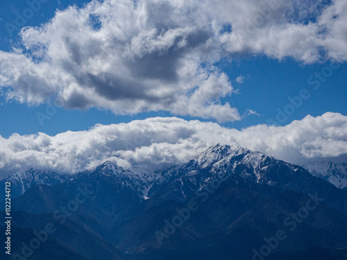 cloud, mountain chain, sky, sunny, mountain, nature, landscape, view, peak, blue skies, japan, tour tourism, travel, town, journey, firmament, city, mountain, aerial, copy space, view, vision, upland, park, plateau, panorama, snow, winter, snow, spring, fall, four seasons, season, climb, trek