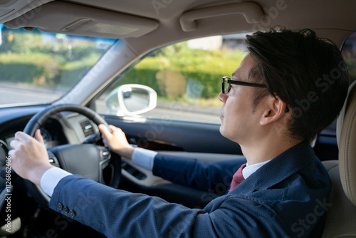 president, driver, suit, man, man, car, car, business, businessman, people, drive, drive, work, taxi, business travel, employee, glasses, cool, good-looking, waist up, japanese, salaried employee, open air, salesman, boss, 30s, rental car, manager, commute, businessman, work, cravat, handle, hold, sedan, outside, smile, second-hand car, youth, seatbelt, attendance, middle-aged