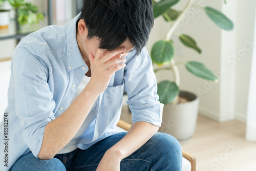 trouble, difficulty, difficulty, thought, contemplate, man, young, japanese, people, house, home, house, residence, apprehension, disapproval, unrest, repentance, drop, casual, couch, seated, copy space, chair, black hair, flop, negative, person, couch, depression, stress, face, sad, weary, lifestyle, unhappy