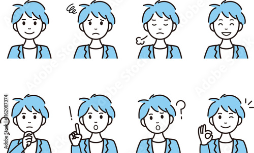 icon, set, business, vector, businessman, expression, smile, surprise, shock, apprehension, pose, employee, startup, illustration, work, work, people, recruit, salaried employee, project, man, face, interview, corporate, planning, suit, corporation, office, young, 30s, japanese, venture, meeting