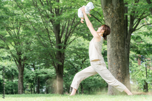 yoga, diet, mother, woman, baby, exercise, cosmetic, mother, gymnastics, child rearing, yoga, children, pursuit, massage, health, health care, sport, park, verdure, green, smile, forest, exercise, refresh, fitness, nature, natural, grass, young, 30s, japanese, asian, chinese, people