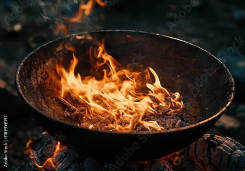 焚き火で温まる大きな鉢の炎が揺らぐ夜のキャンプの様子