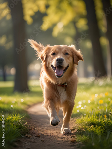 충성스러운 강아지가 공원을 가로지르며 혀를 굴리고 귀를 바람에 펄럭이며 인간과 함께 뛰어갑니다.