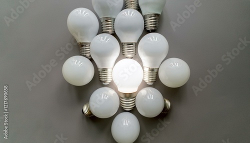 일렬로 나란히 정렬된 여러 개의 하얀 전구 중 하나만 빛을 밝히고 있는 모습