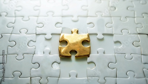 수많은 흰색 퍼즐 조각들로 이루어진 테이블 위에 하나의 금빛 퍼즐 조각이 중앙에 놓여 강렬하게 빛나는 장면