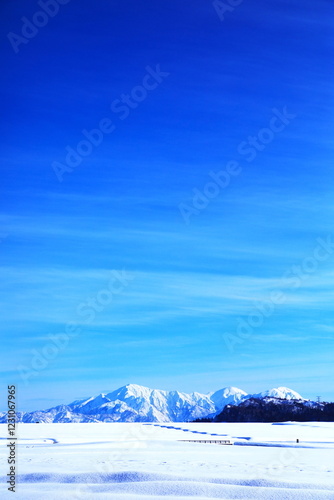 雪原に広がる青空と美しい雪山
