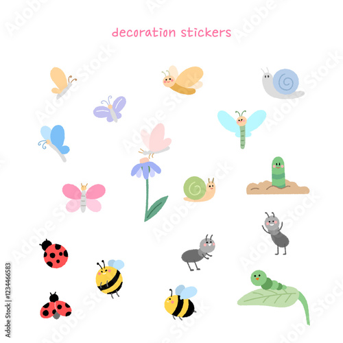 diary, sticker, icon, spring, nature, coccinellidae, insect, butterfly, snail, caterpillar, bee, flower, set, decoration, cute