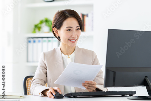 business, office, woman, middle-aged, japanese, people, personal computer, computer, document, smile, career woman, suit, work, work, desk, table, smile, corporation, corporate, office, office, waist up, face, copy space, report, woman, smiling, person, corporate, employee