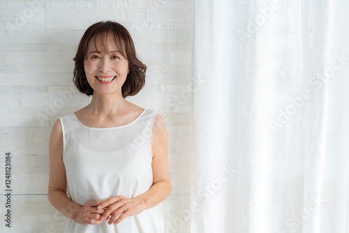 woman, lifestyle, beauty, smile, aged, positive, coiffure, japanese, 50's, 60's, middle-aged, indoor, house, cosmetic, natural, beauty, smile, face, people, lively, health, light, skincare, copy space, waist up, pretty, fun, shiny, young, second life, refresh, este, teeth, hair care, cheek, fold
