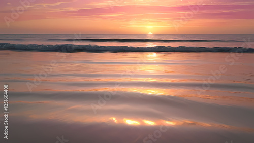 このデジタルグラフィックリソースは、穏やかな海の夕焼けの美しさを捉えています。軽やかな波が岸辺を撫で、金色の反射が水面で踊ります。空の優しいグラデーションは、ピンクからゴールドへと変化し、幻想的でリラックスした雰囲気を演出します。洗練されたデザインプロジェクト、エレガントなブランディング、ロマンチックな背景、芸術的な構成に最適です。