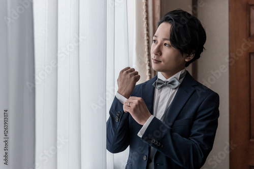 groom, wedding, bow tie, groom, tuxedo, jacket, vest, solemnization, wedding reception, smile, man, marriage, preparation, preparation, meeting, fitting, change, rehearsal, wedding, set, put on, asian, 30s, party, indoor, korean, chinese, young, indoor, japanese, people