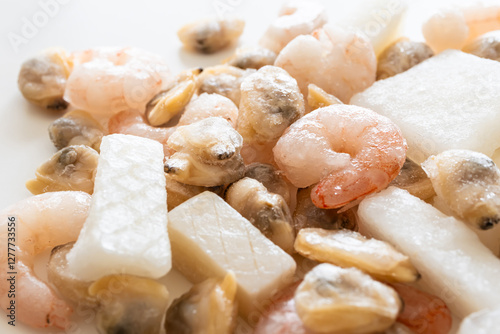 seafood, seafood, glacé, frozen food, food, foodstuff, cuttlefish, shrimp, clam, white background