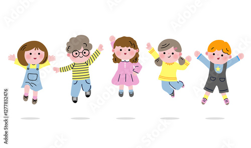 jump, children, frolic, fun, boy, girl, pop, vector, sweet, colourful, blue, glasses, pink, illustration, group, smiling