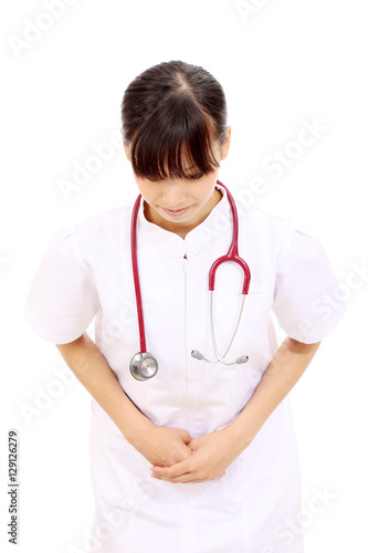 nurse, nurse, nurse, nurse, japanese, sweet, pretty, work, greeting, customer service, bow, bow, bow, apology, gratitude, adieu, send, payback, greet, greet, woman, woman, girl, hand, stethoscope, white, young, portrait, model, waist up, background, white background, hospital, clinic, studio, labcoat, medical care