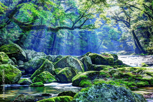 morning sun, light, stream, canyon, moss, rock, river, stream, green, verdure, nature, landscape, kyushu, flow, tourist attraction, showplace