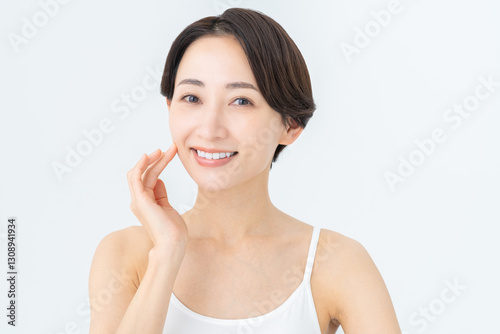 skincare, skin, woman, cosmetic, pointer, japanese, people, white background, cami, camisole, white, bare skin, health, health care, lifestyle, waist up, face, woman, beauty, model, person, studio, natural, middle-aged, short hair, smile, smile, smiling, clean, up, felt, healthy, happiness