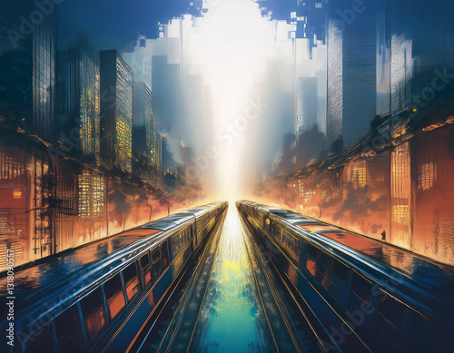 地下鉄のトンネルや高層ビルの影の中で光が広がり、ビルの光と影が自己探求の舞台を映し出すアブストラクトな都市景観